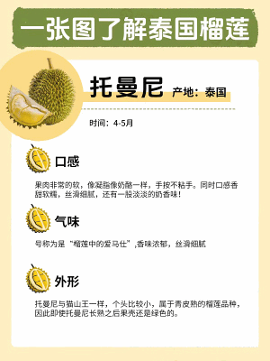 目前业内大部分音译为“托曼尼”,也有人称这款榴莲为“香玛尼”,指的都是这款原产于 |